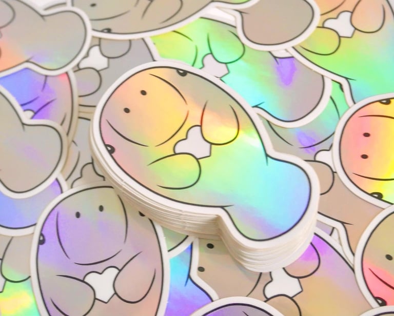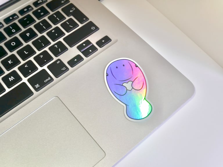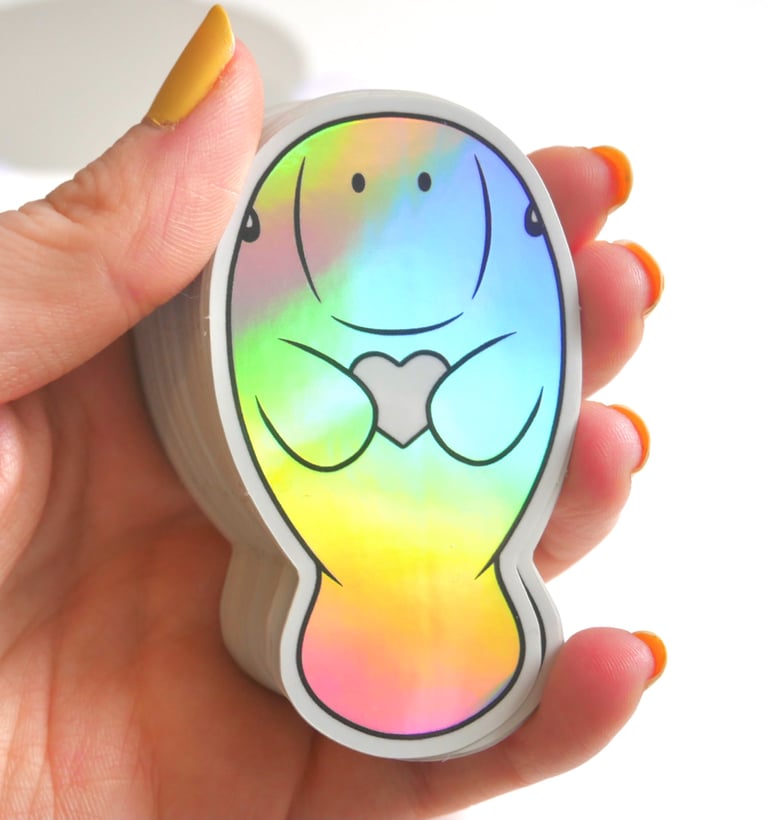 This holographic glossy coated vinyl manatee sticker reflects a beautifully shiny and unique rainbow in all light, and carries a little heart wherever it goes. Durable for cars, dishwashers (perfect for a reusable cup!) laptops, phones etc. and 2-4 year weather proof.